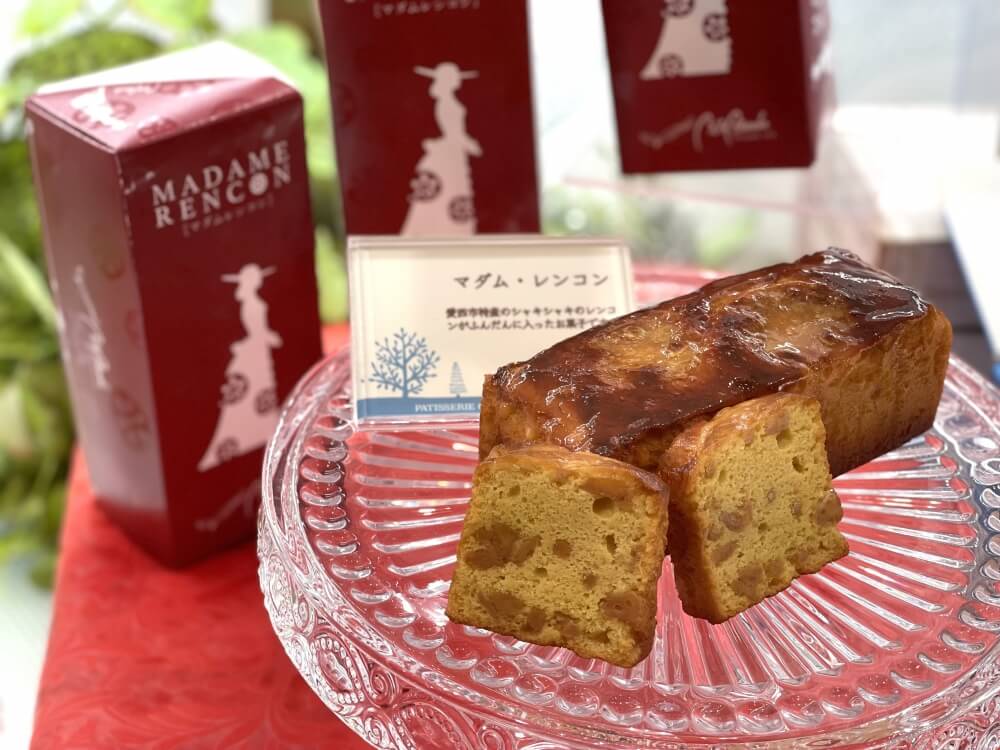 フルーツケーキのようにしっとりした生地にたっぷりのレンコンが入ってるのが特徴。冷やしてから召し上がっていただくのがオススメです。